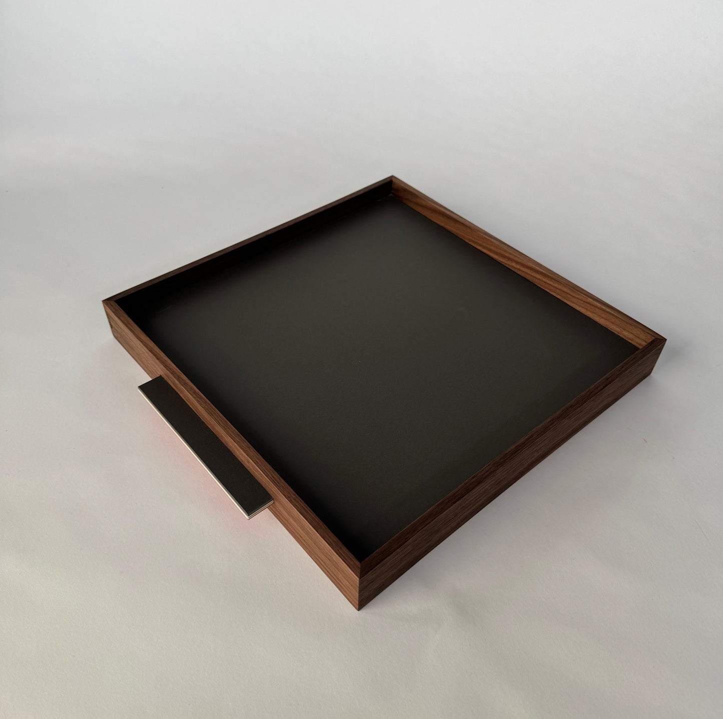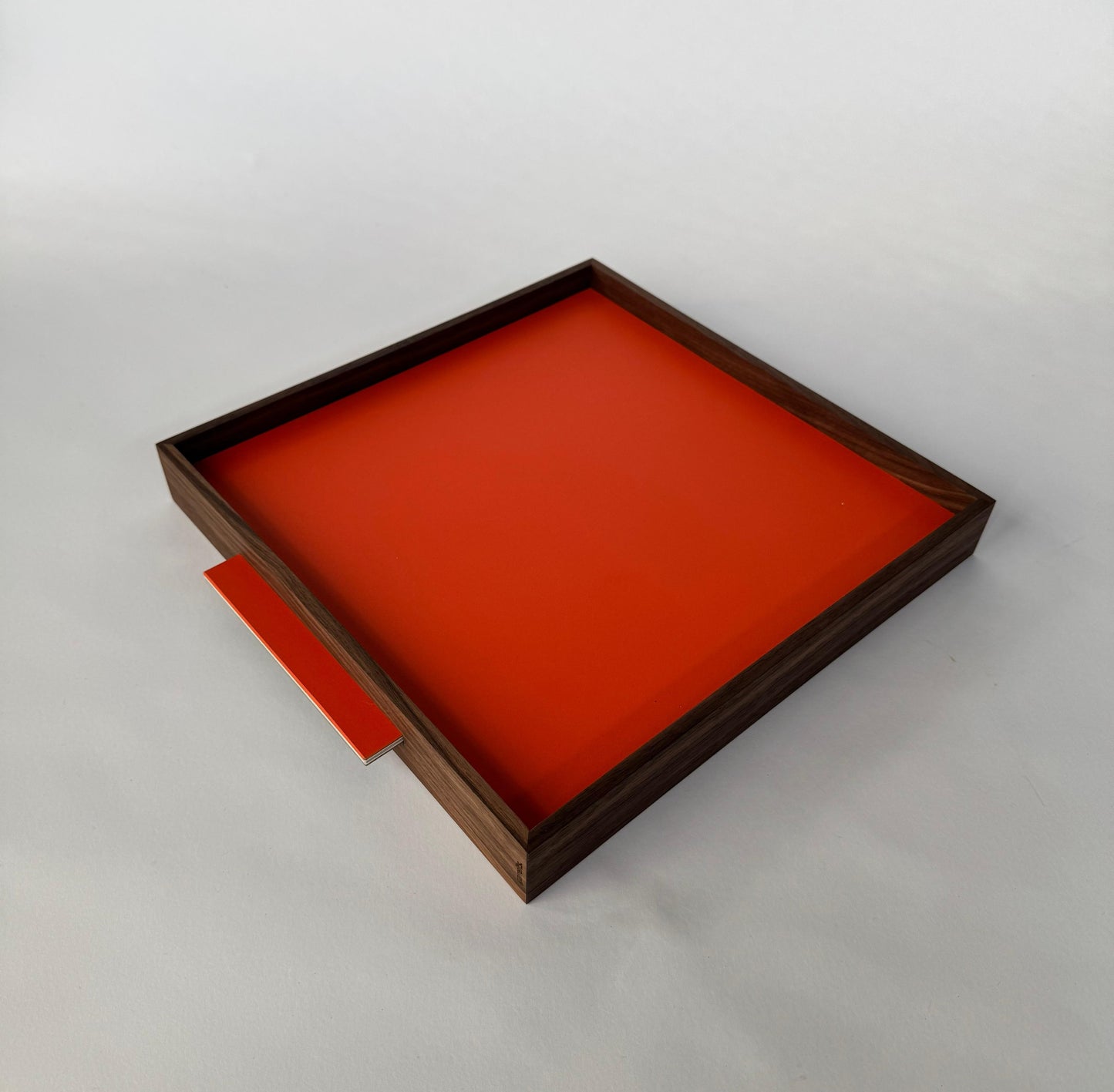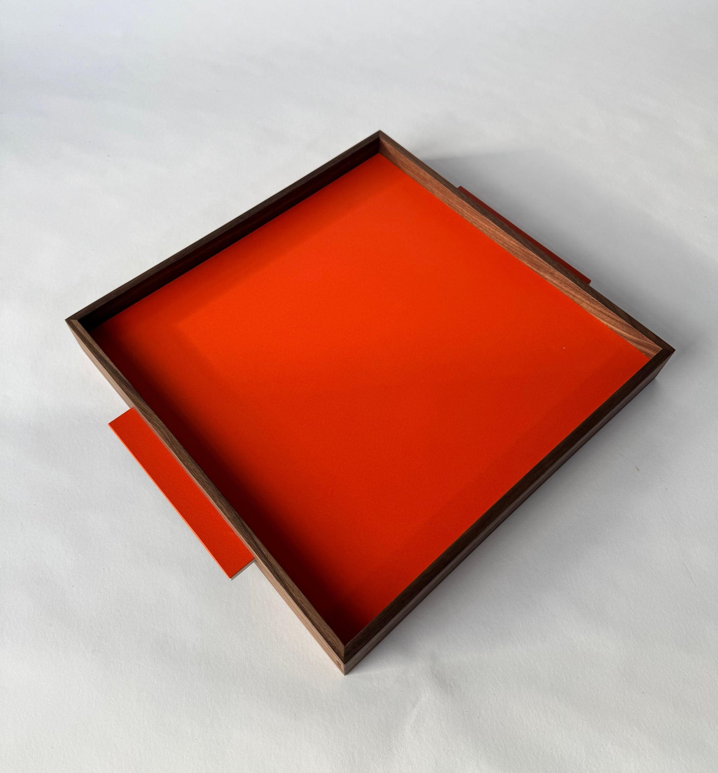 Reversible tray made of American walnut and linoleum in orange and dark grey/charcoal.