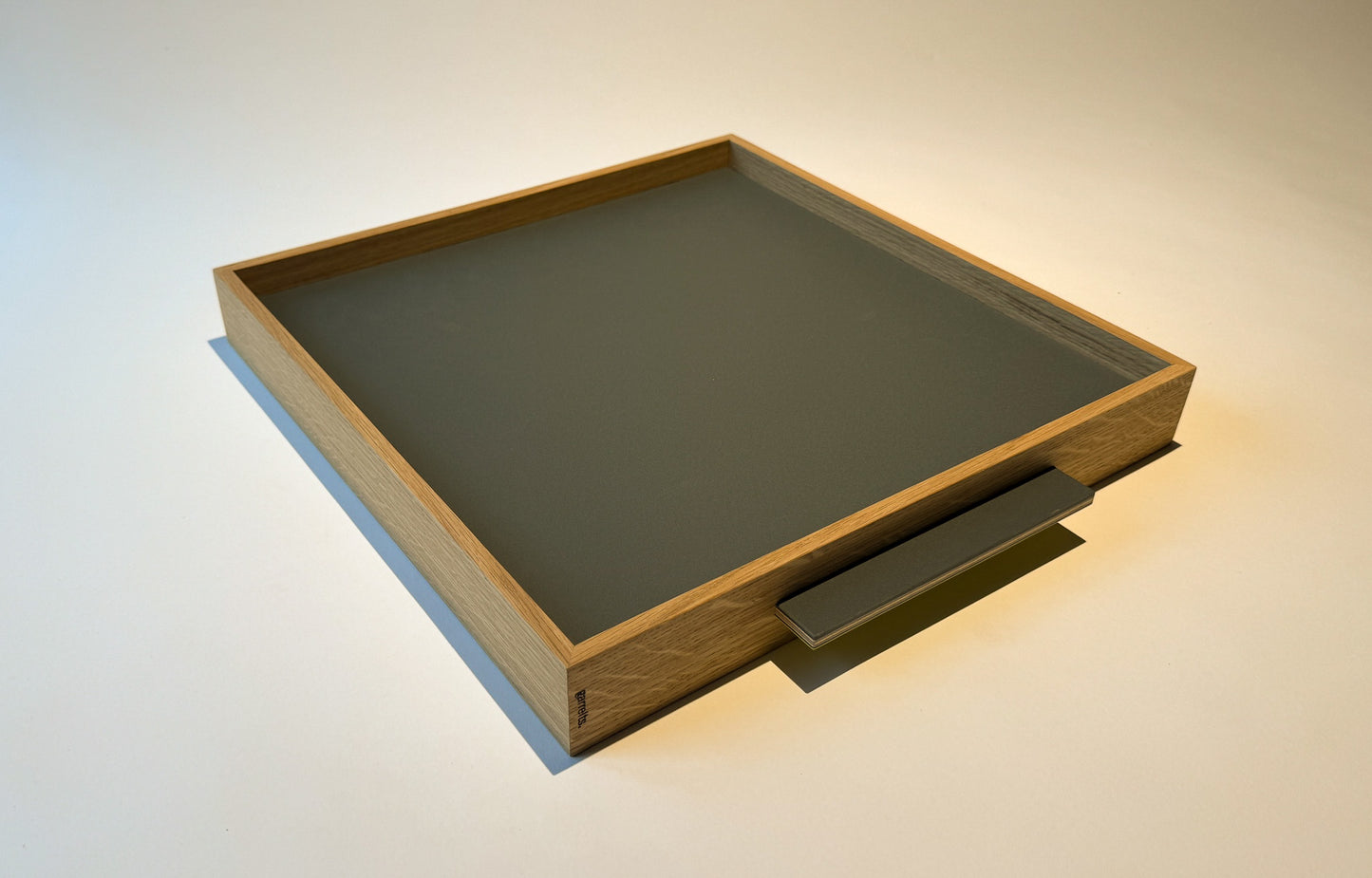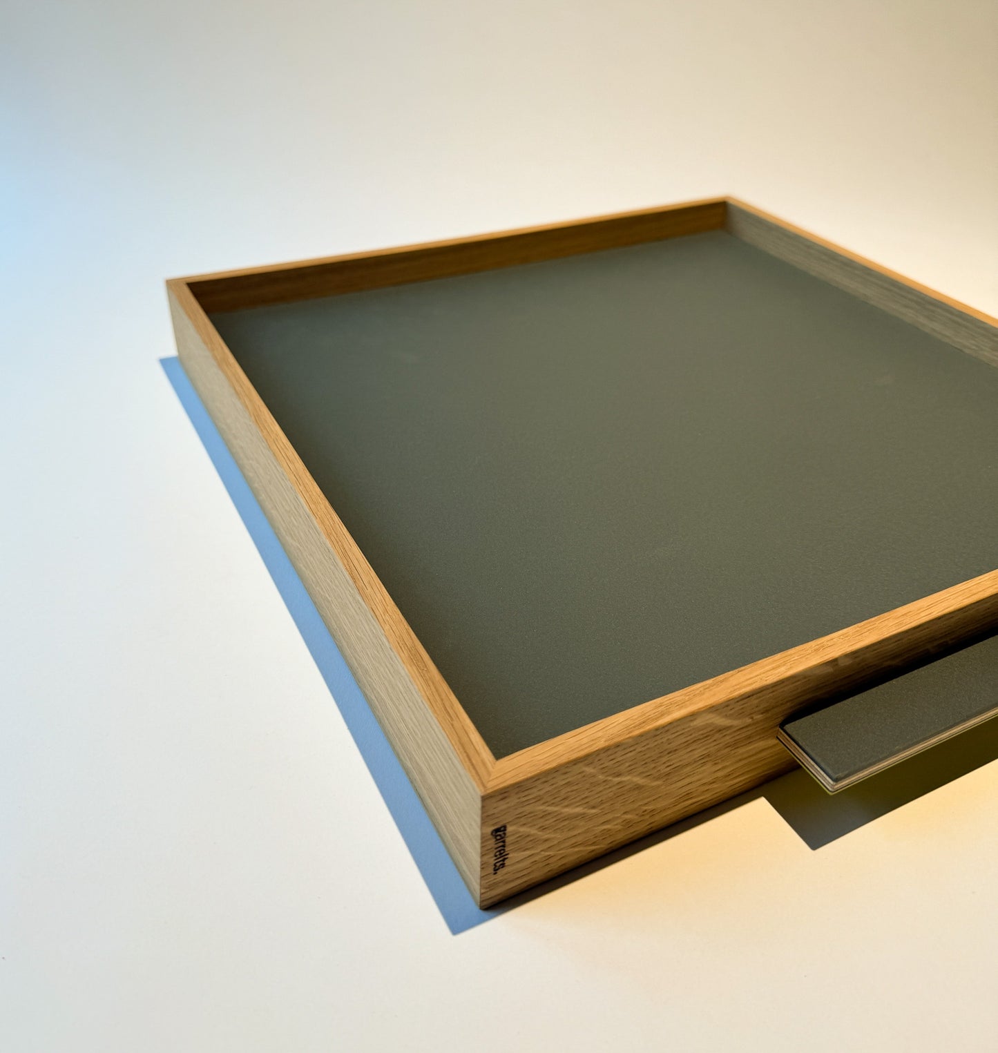 wendetablett aus europäischer eiche und linoleum in den farben hellgrün und dunkelgrau